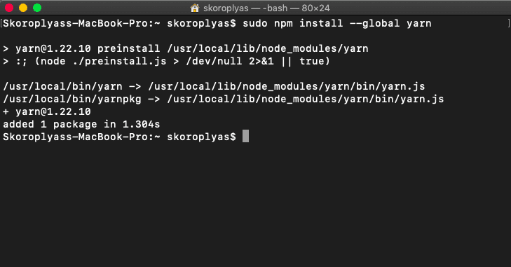 Затем установите пакетный менеджер yarn. Он загрузит Taquito и автоматически пропишет его в системе.