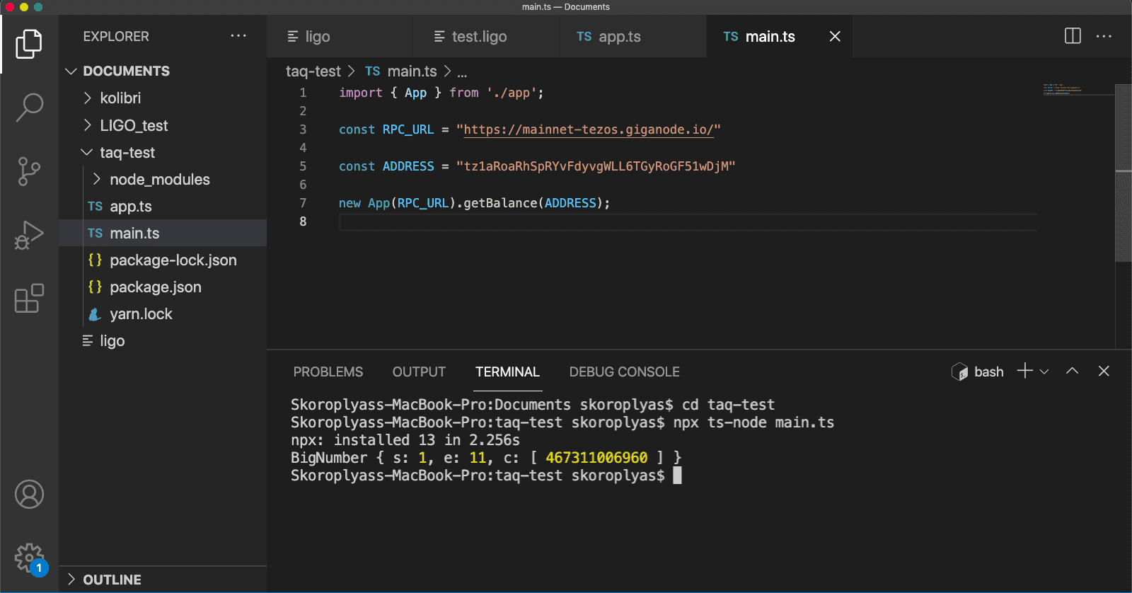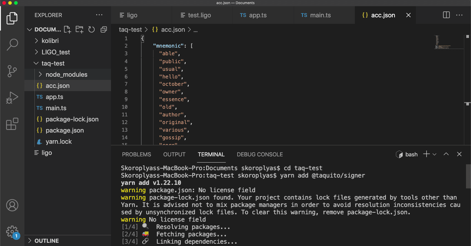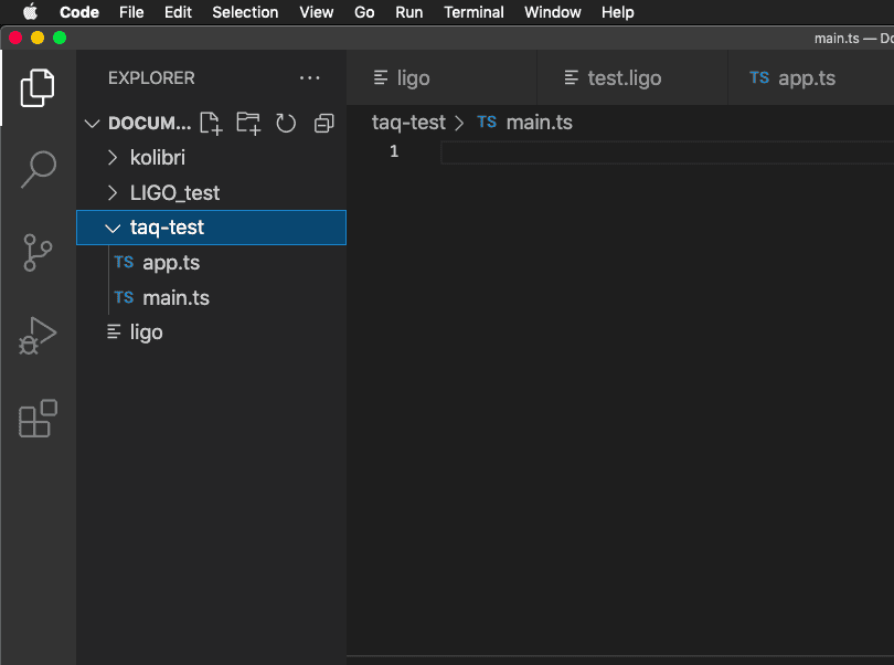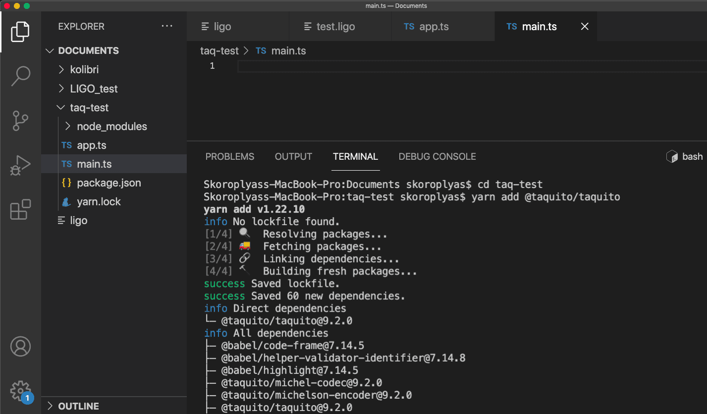 sudo npm install --global yarnСредства для работы Taquito готовы, осталось протестировать ее работу. Откройте Visual Studio Code, создайте новую папку taq-test, а в ней — два файла с названиями app.ts и main.ts.