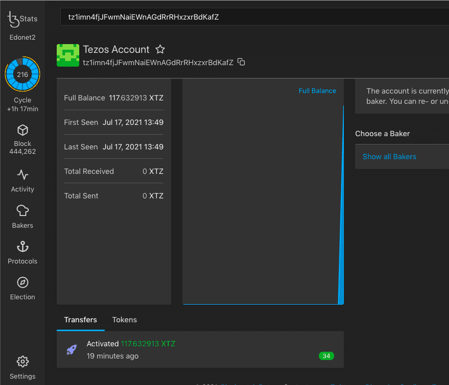 Откройте acc.json и скопируйте публичный ключ из поля «pkh». Перейдите на florence.tzstats и найдите свой аккаунт по публичному ключу. На балансе должно быть около сотни тестовых tez, а в истории транзакций — запись об активации.
