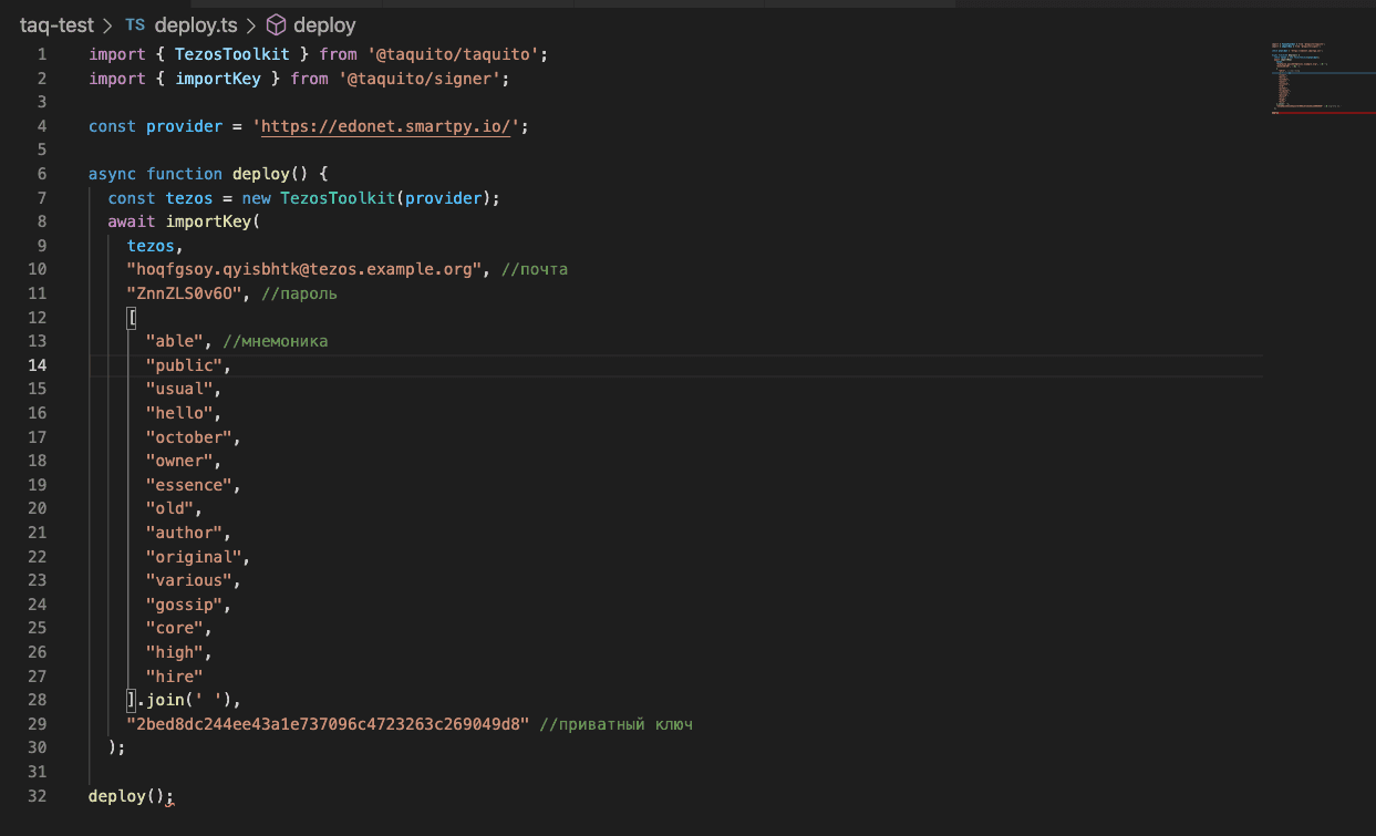 deploy();Впишите в пустые места данные аккаунта: почту, пароль, слова мнемонической фразы и приватный ключ из файла acc.json.