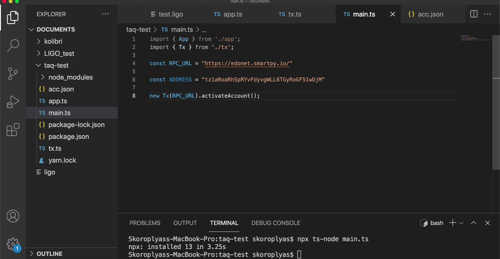 npx ts-node main.tsТерминал отчитается о запуске npx одной строкой. Это значит, что npx удачно импортировал в приложение Taquito. Так как главная функция app.ts пустая, npx сразу ее завершил. Другой результат при выполнении этого шага означает, что вы допустили ошибку во время установки TypeScript или Taquito.