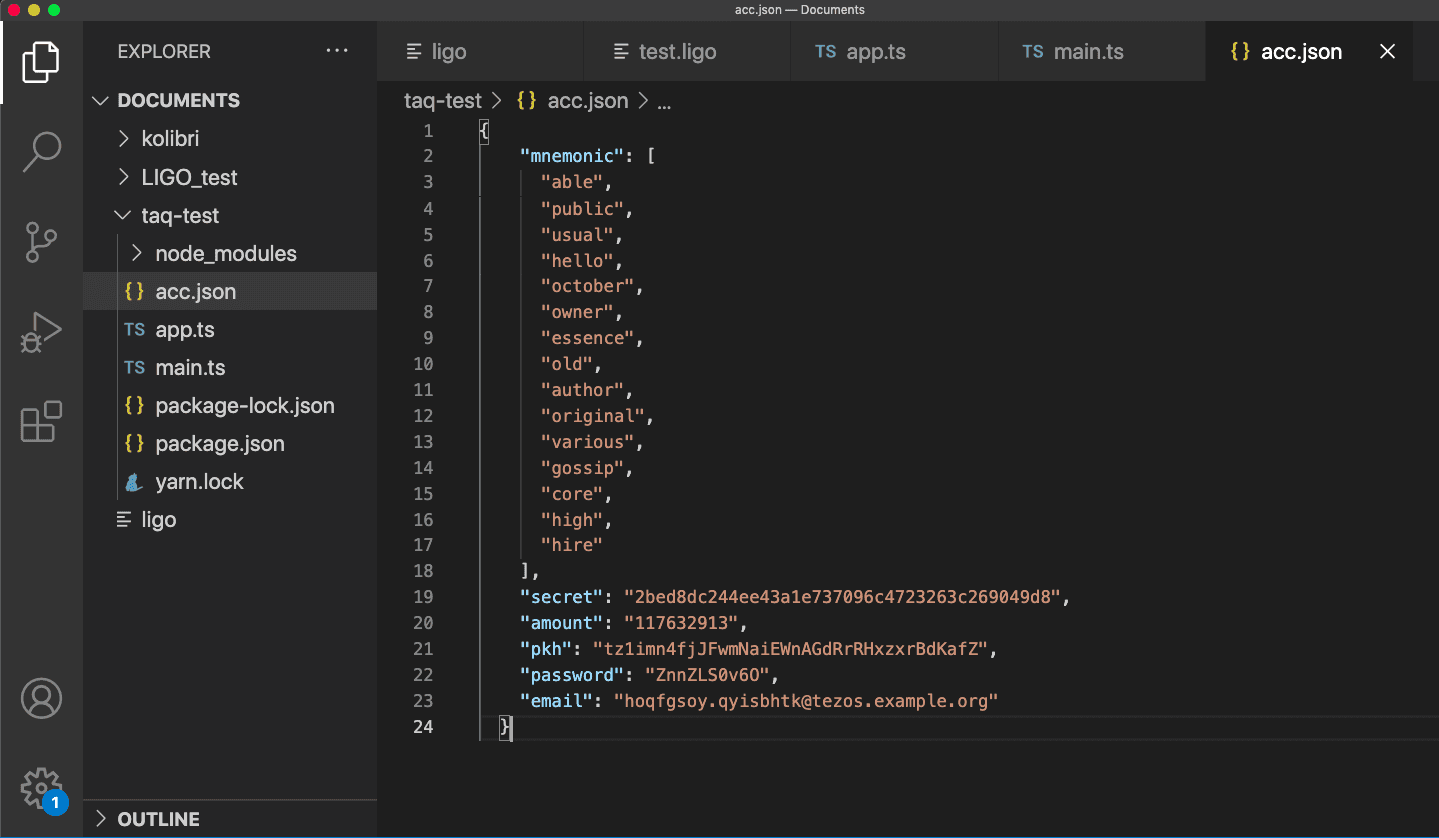 Данные аккаунта нужно сохранить в отдельном файле. Создайте в папке taq-test файл acc.json и вставьте в него код из tzalpha.