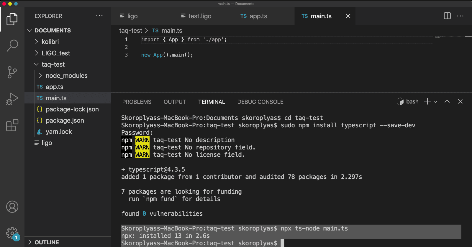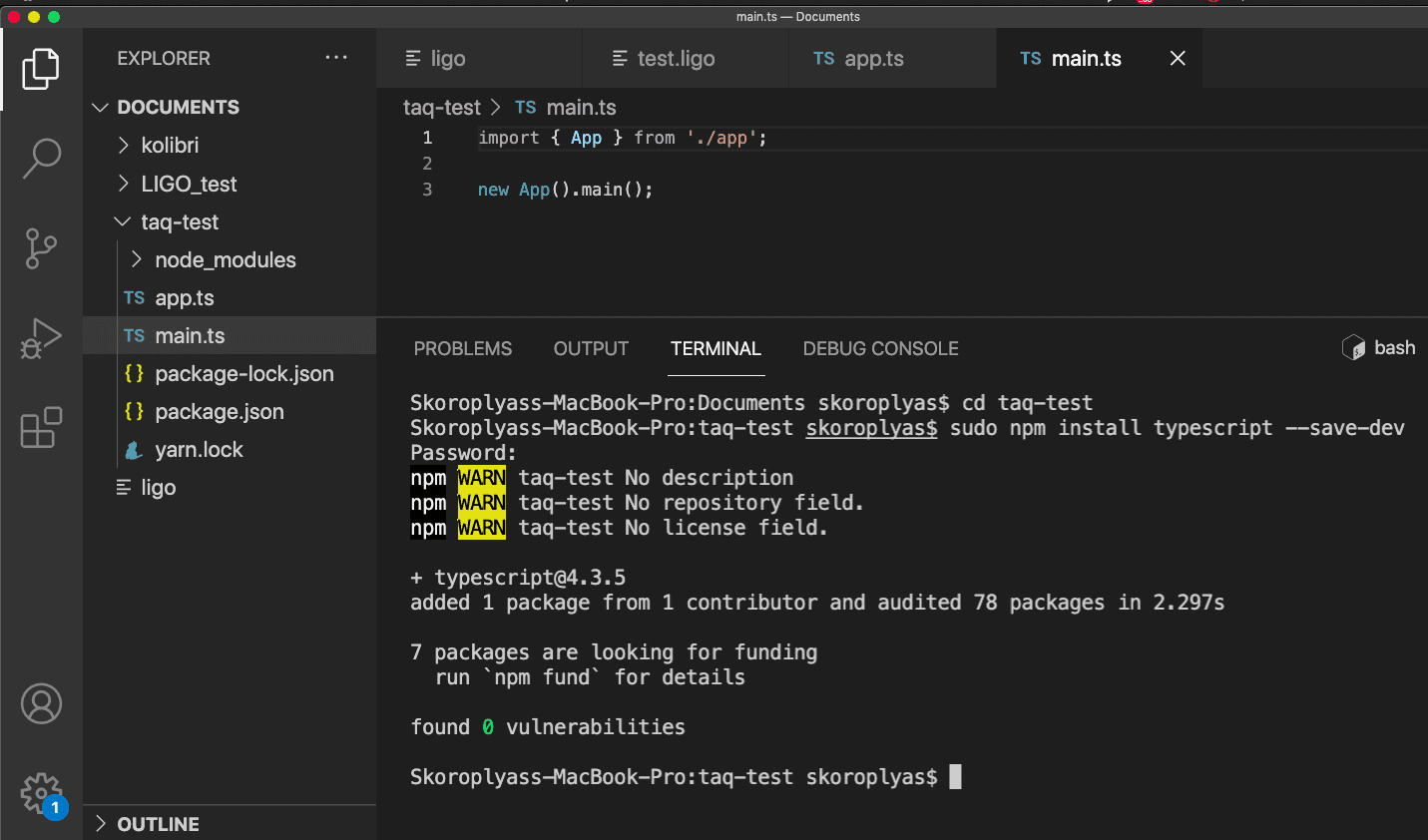 sudo npm install typescript --save-devПри успешной установке терминал выдаст 3-4 предупреждения об отсутствии лицензии и описания проекта. Если в списке больше пунктов — вы забыли добавить sudo в начале команды или не находитесь в папке taq-test.