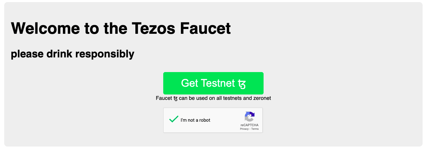 Чтобы не тратить настоящие tez, мы подключимся к Tezos Testnet. Сначала нужно получить адрес и тестовые tez на кране tzalpha. Перейдите по ссылке, подтвердите, что вы не робот, и нажмите кнопку Get Testnet tez.