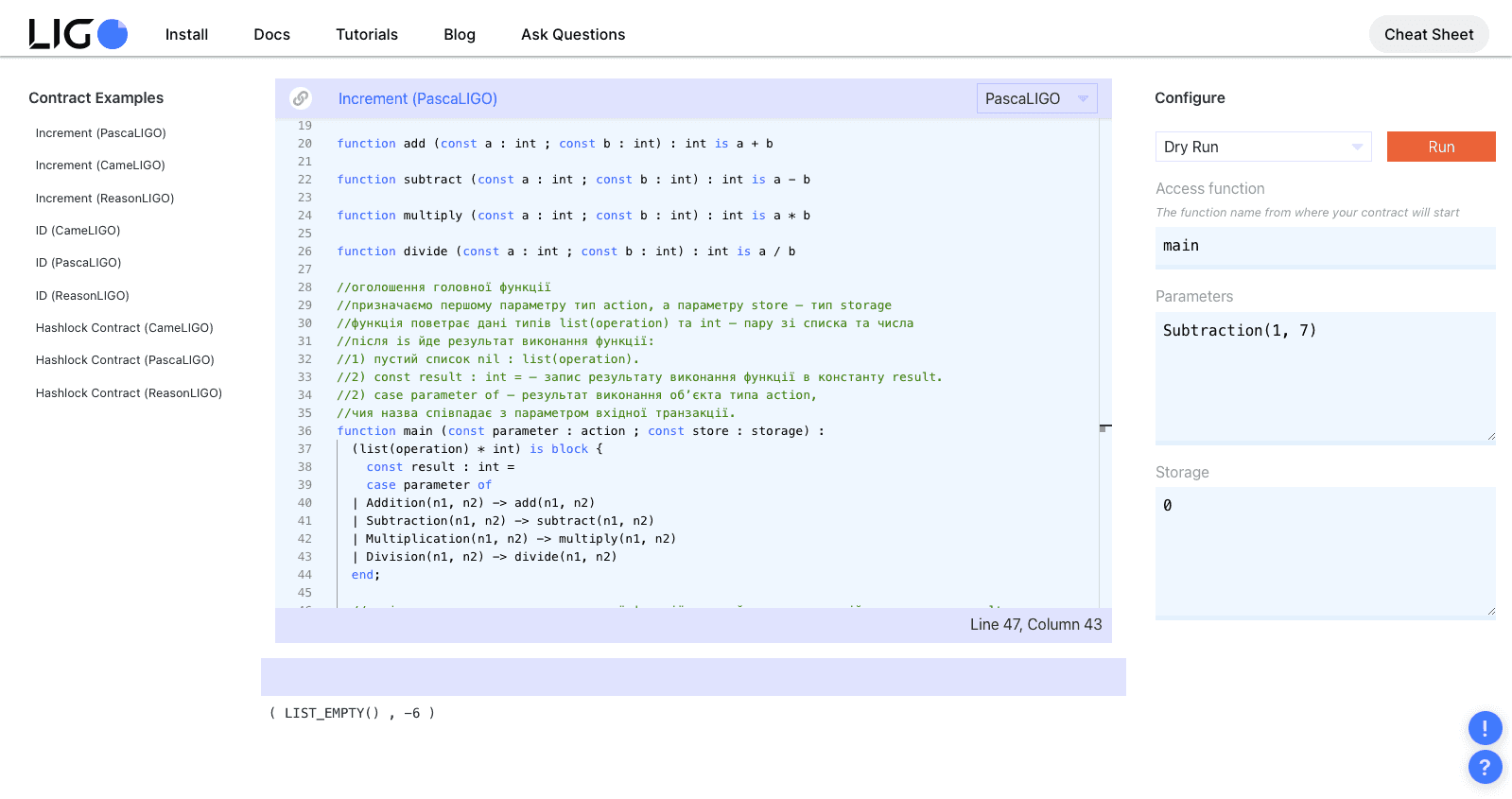 Для перевірки смарт-контракту скопіюйте код калькулятора в редактор на ide.ligolang.org. Виберіть значення Dry Run зі списку на панелі Configure. В поле Parameters введіть назву математичної операції і два параметра, а потім натисніть кнопку Run.