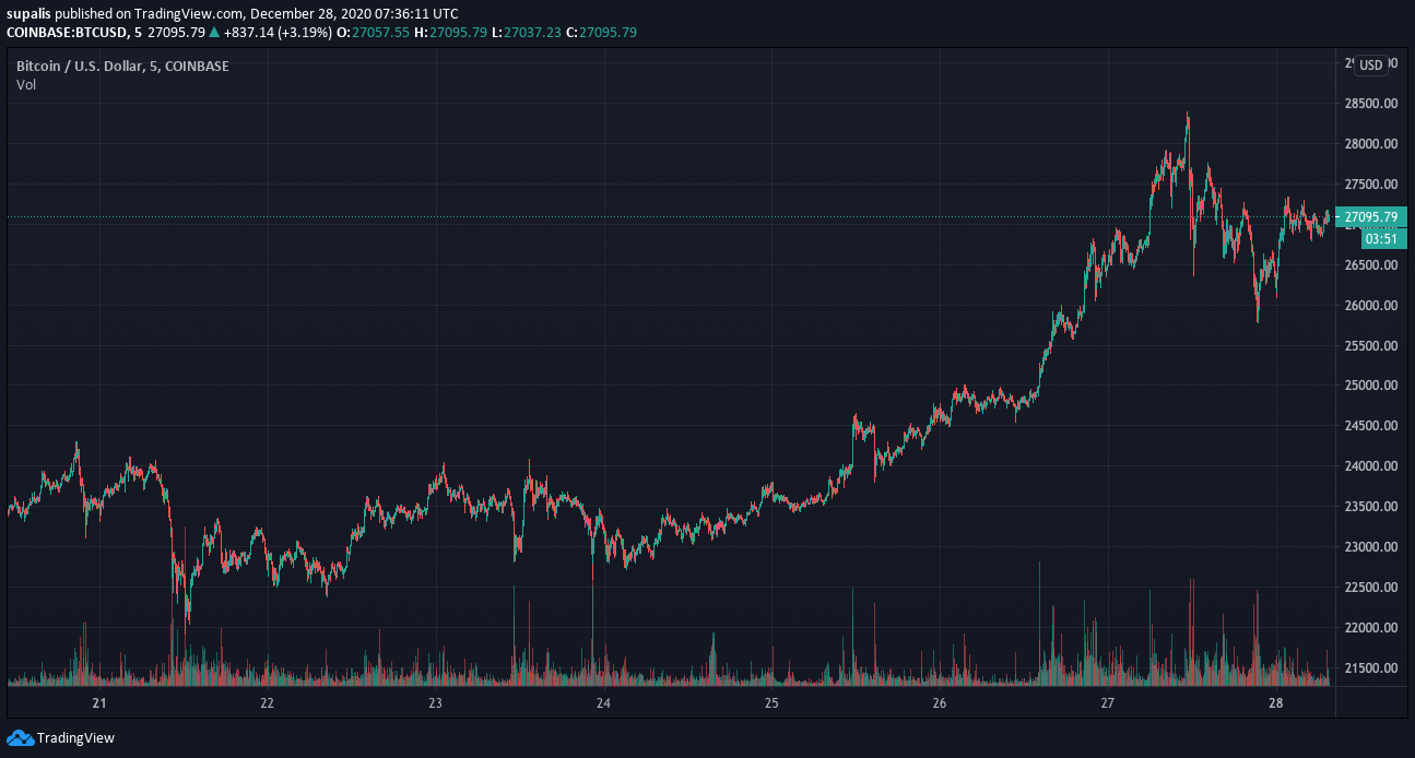 27 декабря, в воскресенье, цена первой криптовалюты достигла рекордного значения $27 500.