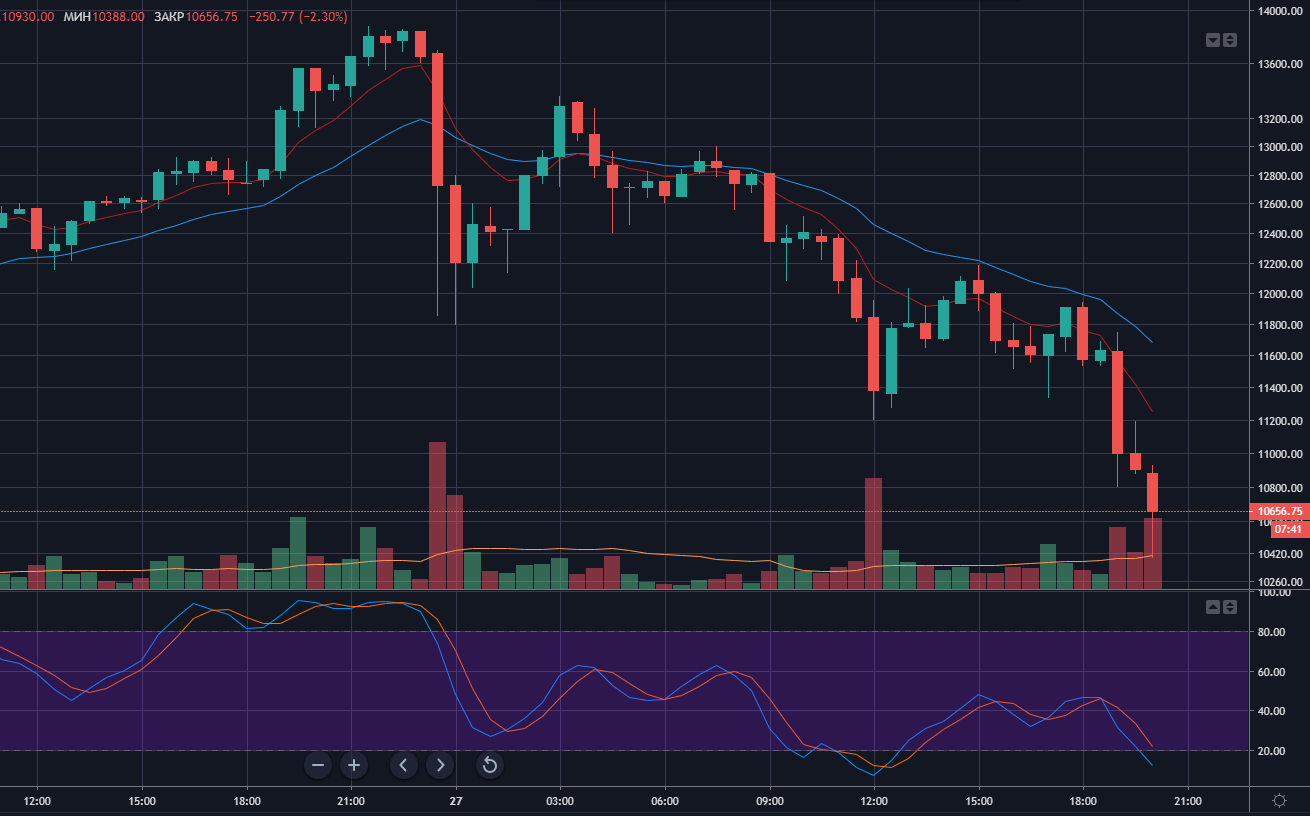 Еще вчера вечером, 26 июня, первая криптовалюта вплотную подбиралась к отметке $14 000. Однако сейчас биткоин торгуется в районе $10 600.