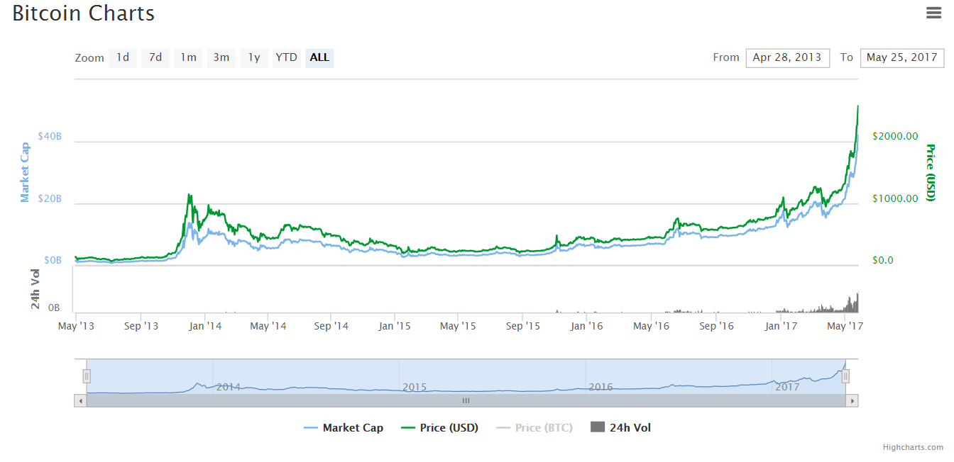 В ночь на четверг, 25 мая, цена биткоина обновила новый исторический максимум, поднявшись выше $2500.