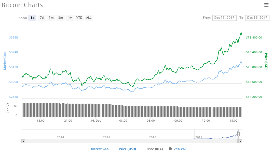 В субботу, 16 декабря, средневзвешенный курс биткоина впервые превысил отметку в $19 000. По состоянию на 14:20 UTC этот показатель, по данным Coinmarketcap, составлял $19 060,90.