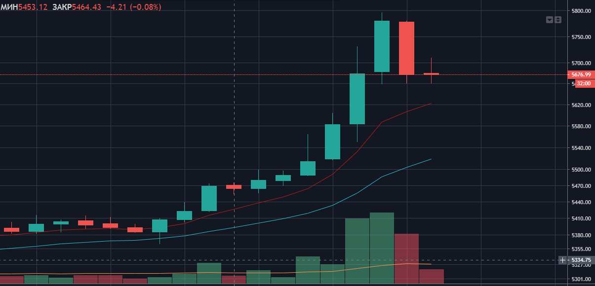 В течение суток биткоин вырос на 6,2%. Цене удалось коснуться отметки $5796 (биржа Bitstamp), соответствующей значениям второй декады ноября прошлого года.