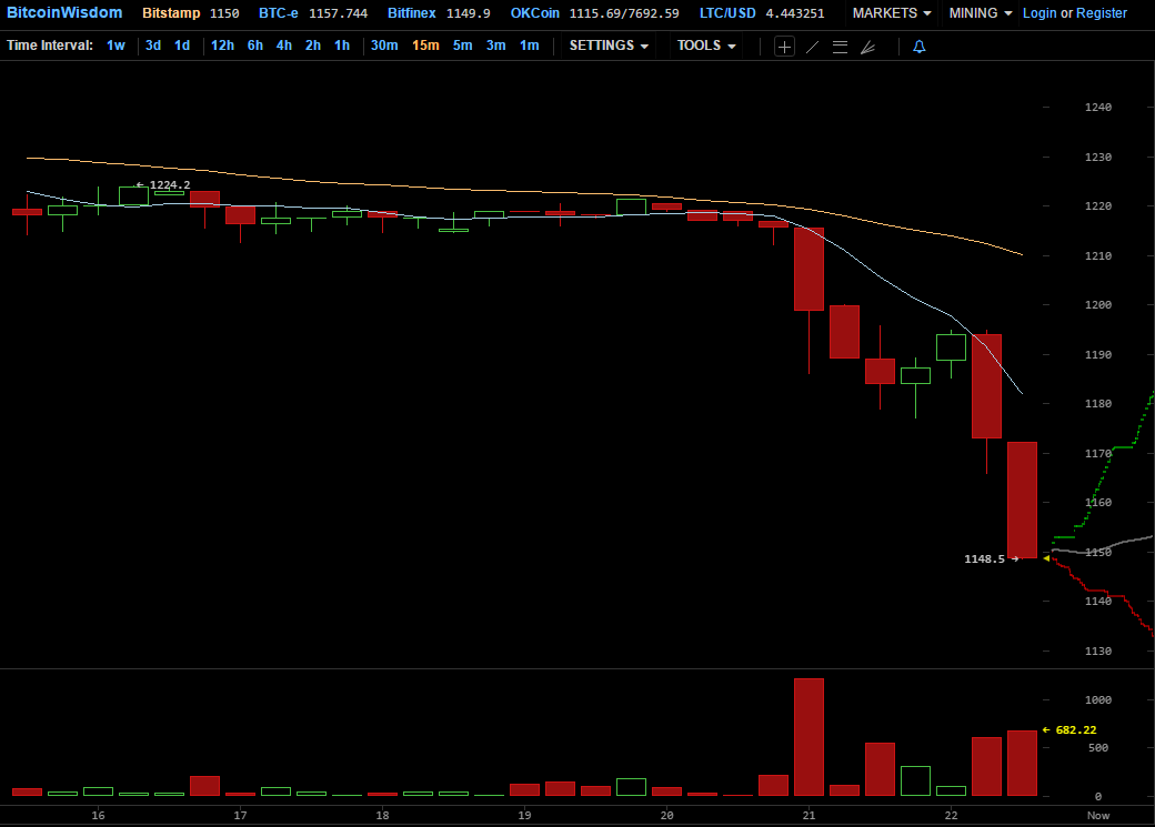 Апдейт 1: В 21:10 GMT цена биткоина на Bitstamp опустилась до $1130.