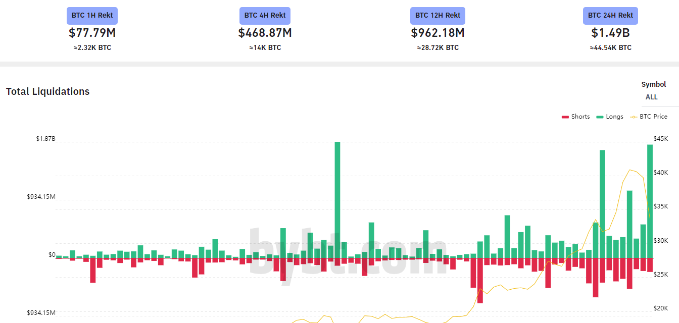 Падение цены привело к ликвидации позиций трейдеров на рынке биткоин-деривативов на сумму $1,49 млрд за 24 часа. Объем ликвидированных позиций по всем монетам составил почти $2,7 млрд.