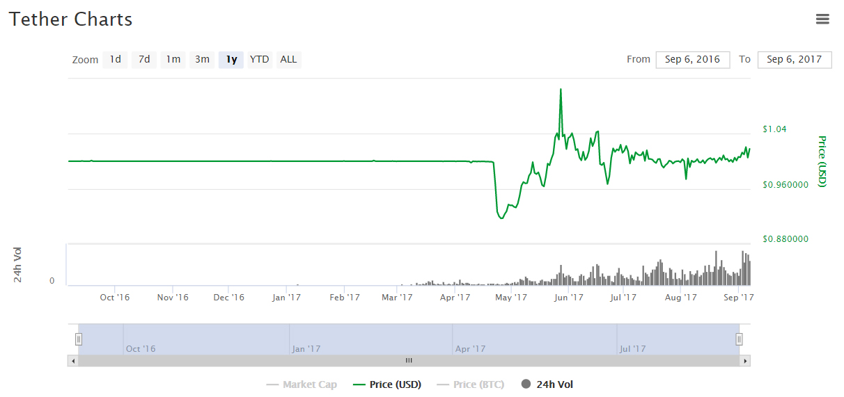 В статье под названием «Любопытный кейс Tether» говорится, что токен был стабилен на протяжении всего 2016 года, и только в марте 2017 года его цена начала подвергаться колебаниям. Случилось это не только примерно в то же время, когда начался стремительный рост цены биткоина, но и совпало по времени с новостью о том, что американский Wells Fargo прекратил сотрудничество с тайваньскими партнерами Bitfinex и Tether, фактически оставив последних без банковского обслуживания.