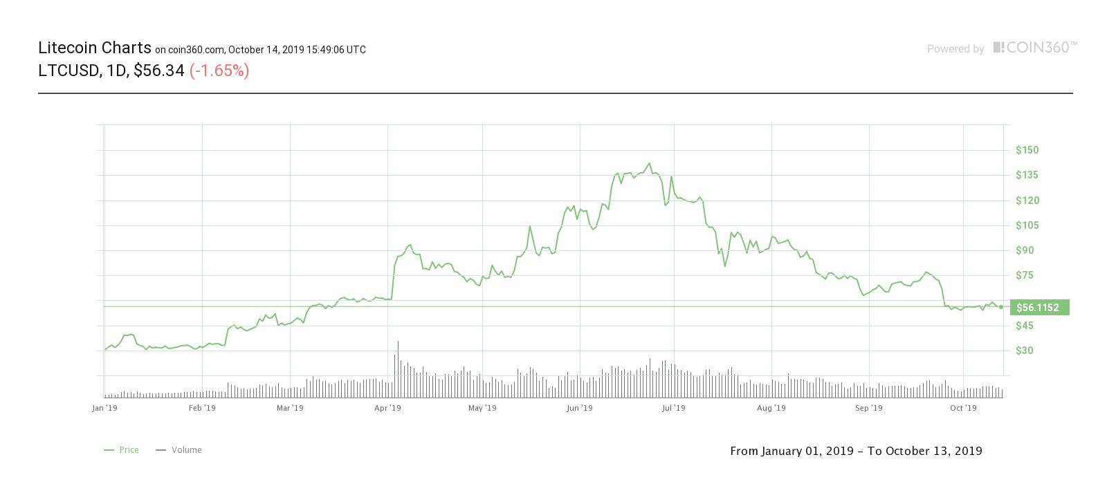 Также отметим, что по сравнению с началом 2019 года LTC торгуется на 88% выше (около $57 по состоянию на 14 октября), хотя за это время криптовалюте и пришлось пережить коррекцию в 60% от июньского максимума.