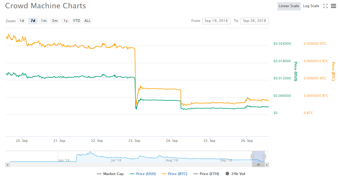 Кошелек Crowd Machine был скомпрометирован в субботу, 22 сентября, однако первое сообщение об этом появилось в блоге проекта только в понедельник. По данным Etherscan, злоумышленникам удалось вывести более 1 млрд токенов Crowd Machine Compute Tokens (CMCT). На фоне инцидента цена токена за сутки (23 сентября) снизилась на 87%, остановив падение на отметке $0.0019. В данный момент стоимость одного токена составляет $0.002698.
